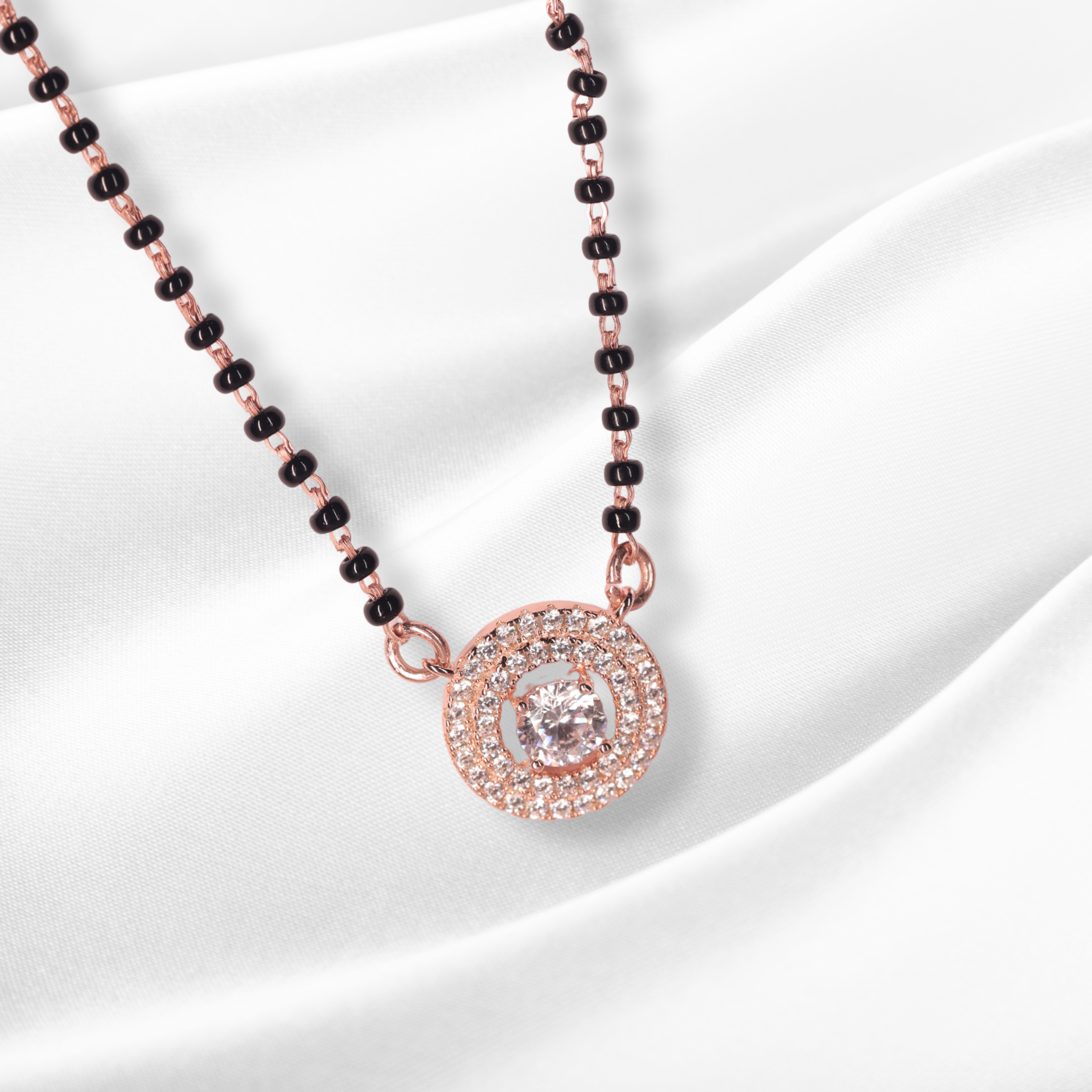 This stunning mangalsutra showcases a circular pendant encrusted with double rows of glittering stones that radiate brilliance from every angle. At the heart of the piece lies a solitaire-style center stone, symbolizing enduring love. The traditional black beaded chain is modernized with fine craftsmanship and a delicate, feminine structure, blending heritage with a contemporary finish.