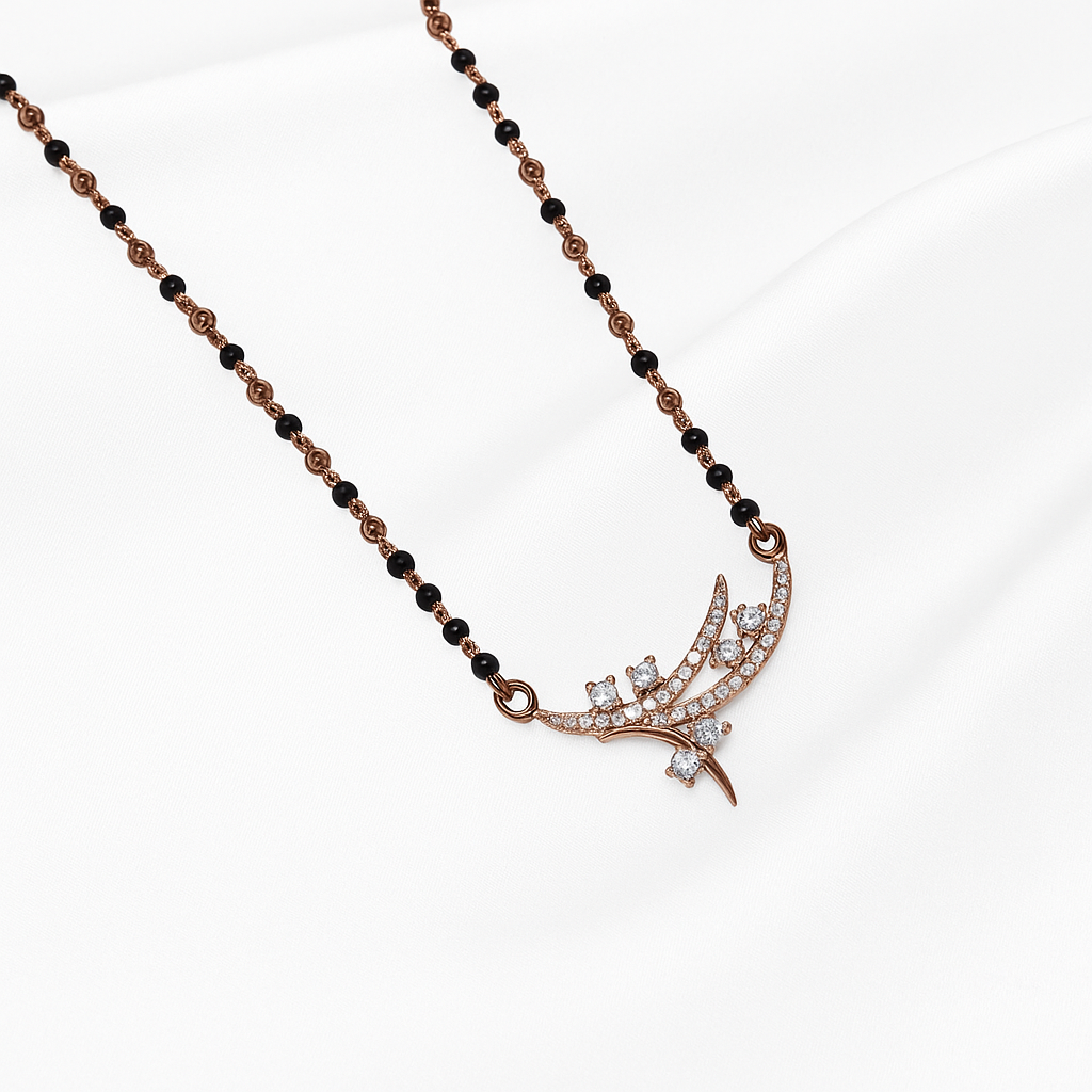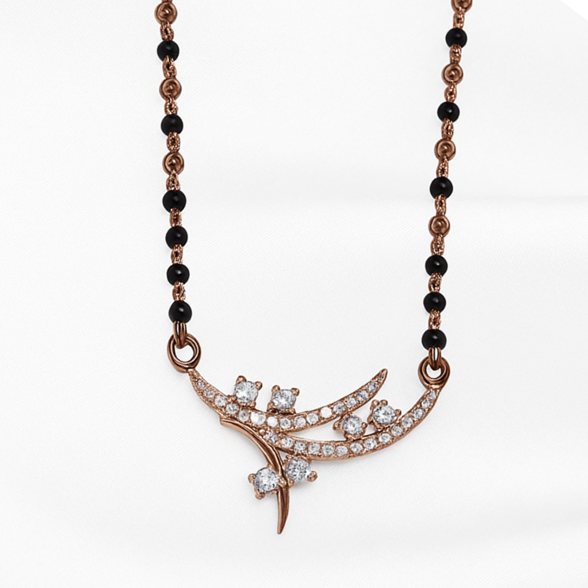 The Saanjh Necklace by Arvana reimagines tradition through a contemporary lens. Crafted from pure 925 sterling silver and finished in luxurious rose gold plating, this mangalsutra-style piece features a gracefully arched pendant adorned with shimmering cubic zirconia, symbolizing growth, love, and continuity. The black beads, a sacred symbol of protection and togetherness, are intricately woven into a delicate yet resilient chain—honoring heritage while embracing modernity.