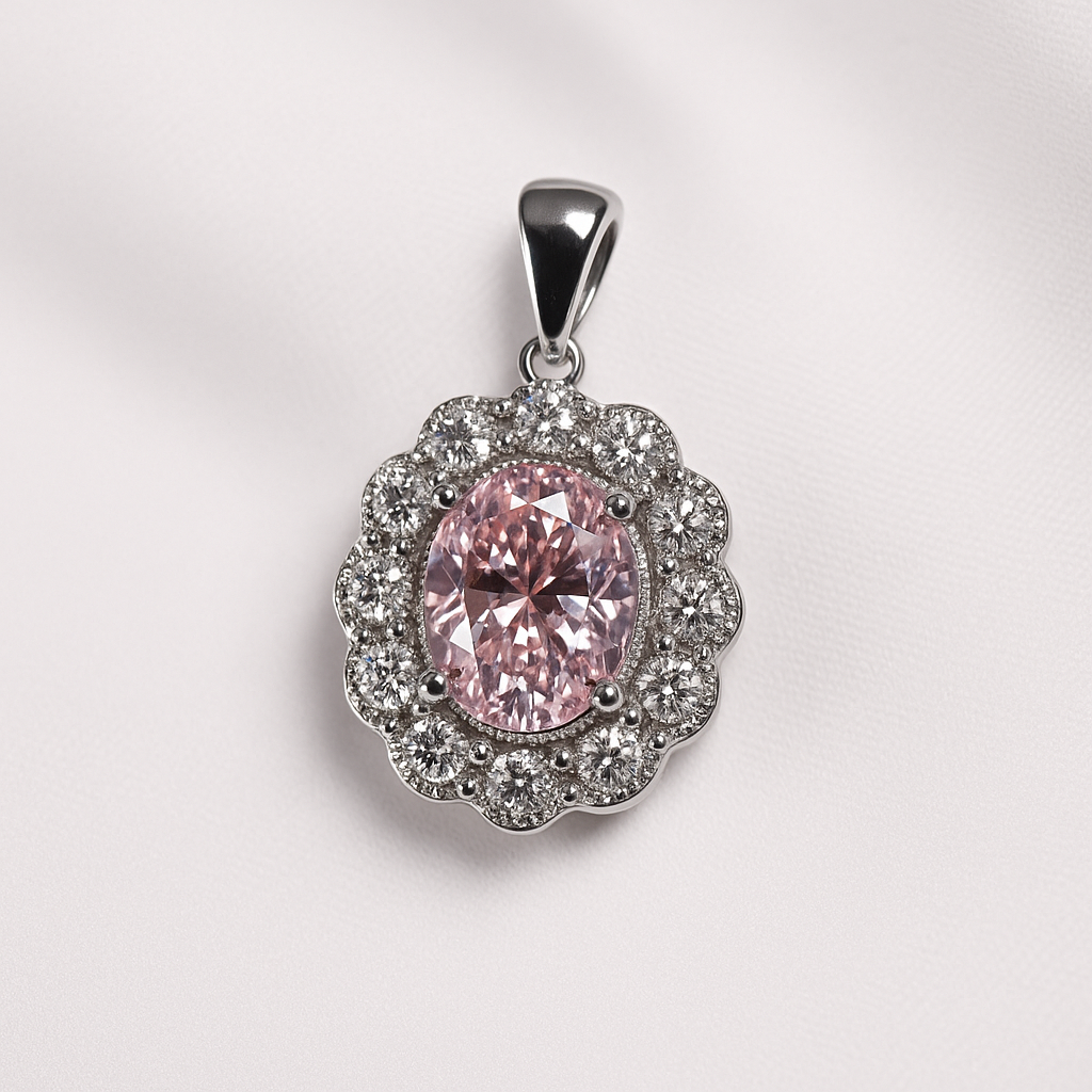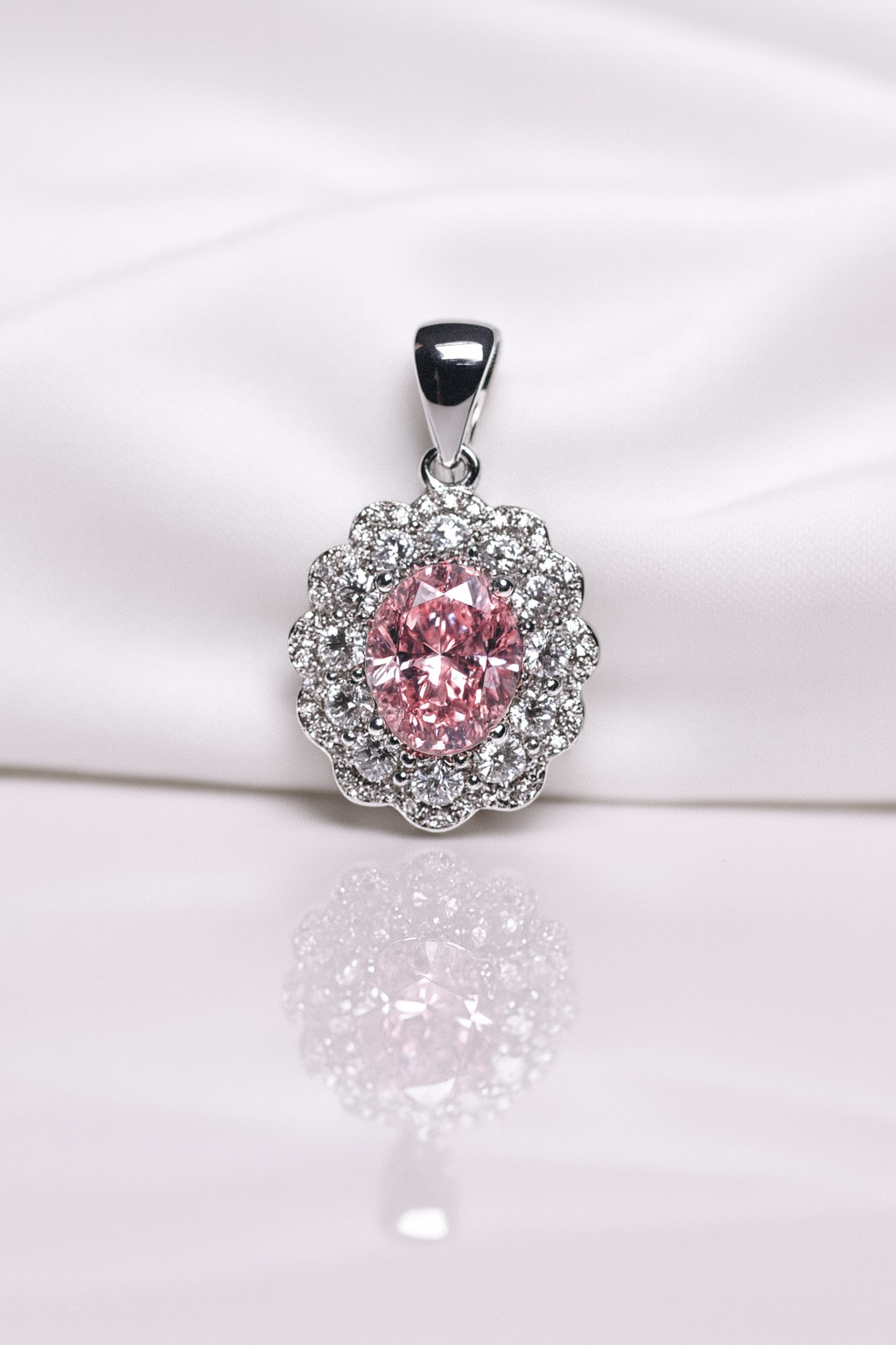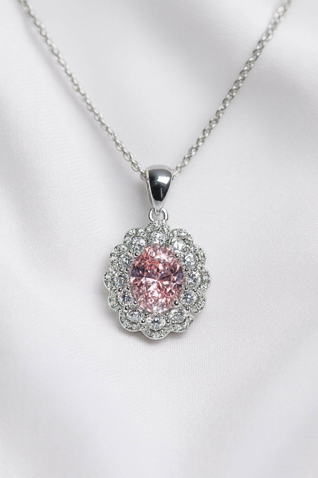 This exquisite pendant is crafted from 925 sterling silver and features a striking oval-cut pink stone