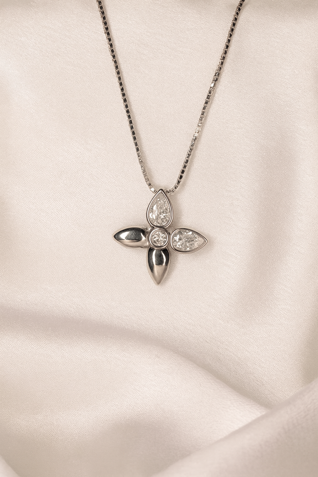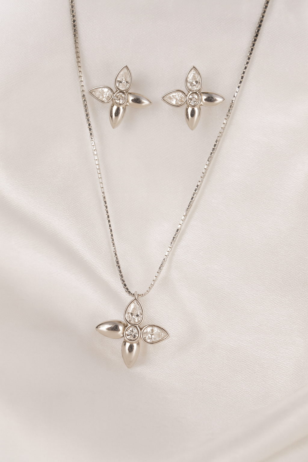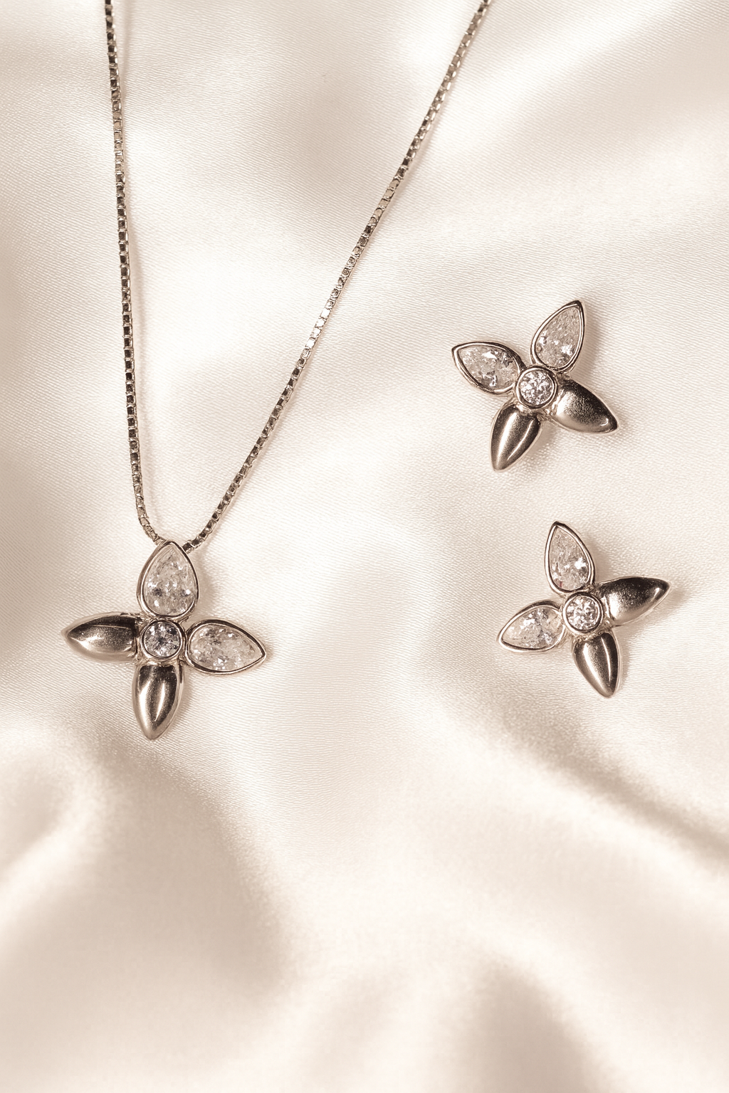 This jewellery set showcases a modern floral motif, crafted with precision in sterling silver. Each petal alternates between a smooth polished finish and a pear-cut zircon, creating a harmonious play of shine and sparkle. At the center, round-cut zircons add brilliance and balance, enhancing the natural elegance of the flower form. Paired with matching earrings, the pendant exudes a sense of graceful femininity and timeless charm.